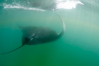 Today’s primary mission was to observe and document the tagging of the Manta Rays by Dr. Graham’s team and Marissa Nuttall, Research Specialist at Flower Garden Banks National Marine Sanctuary. Sea conditions could not have been better: no wind whatsoever (for the first time in the expedition) and flat calm seas. We began in the green, nutrient-rich waters of the nearshore observation site (about 15 miles from Holbox), where one could swim through patches of water so full of life that all the activity actually warms the water. This rich soup of plankton (drifters) and nekton (swimmers) is exactly why the rays are here in such abundance. We observed a dozen of these majestic cousins to the shark, whose “wings” span 3-5 meters or more. Dr. Graham’s team successfully tagged several animals with acoustic tags that will allow them to follow the rays throughout the Caribbean and Gulf of Mexico. This information is crucial to understanding the migratory habits of the rays–and the consequent need to provide them with safe areas to feed, mate and bear young.