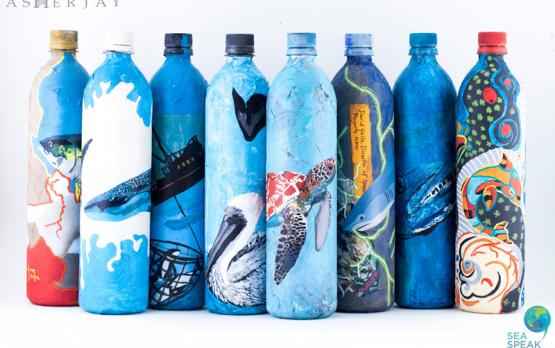 The art installation is made up of 100 painted bottles that bring to life personal statements or “blue memos” about the world’s ocean from some of the biggest names in marine biology, conservation, photography, exploration, journalism and more. Using recycled plastic bottles, scrap paper, and paint Jay has found a way to offer a visual voice to help communicate complex ocean issues, solution strategies and urgent blue memos.