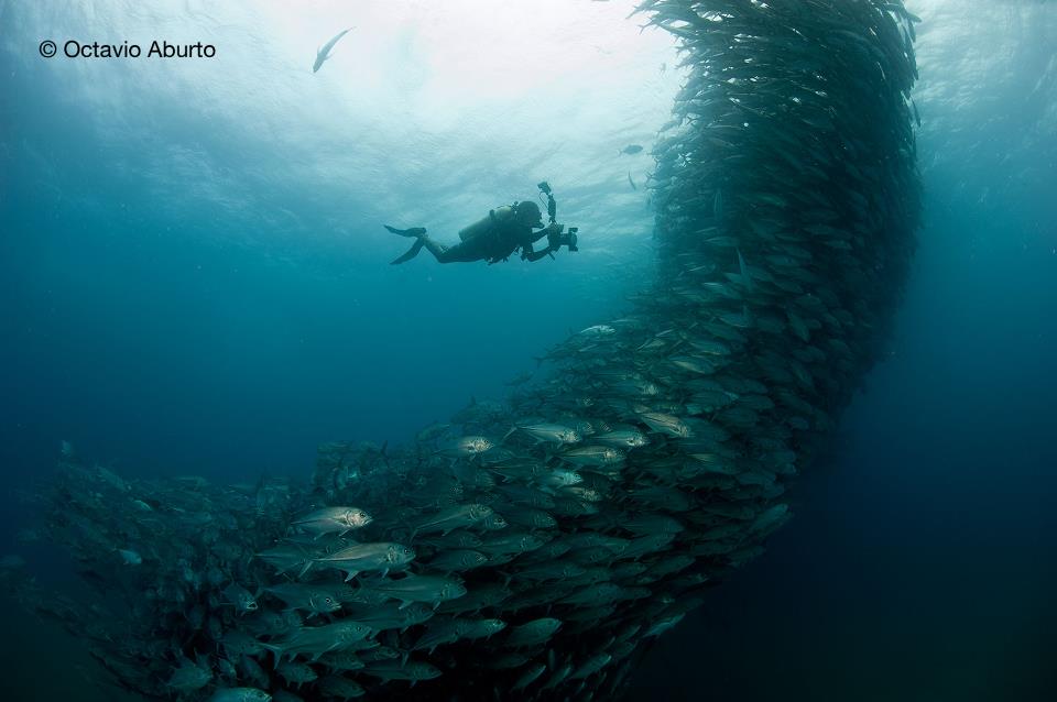 "David and Goliath," Gold Winner at Our World Underwater 2013. Another outstanding photograph of Jack Crevalles at Cabo Pulmo, Mexico. Says photographer, Octavio Aburto, "I have been trying to portray the research and the work being done in Cabo Pulmo, where the “David and Goliath” photo was taken, in a way that is accessible to the public and in such a way that it can be easily shared. Through this photo and other photos I hope to tell the success story of marine protection in Cabo Pulmo where I conduct my scientific research."