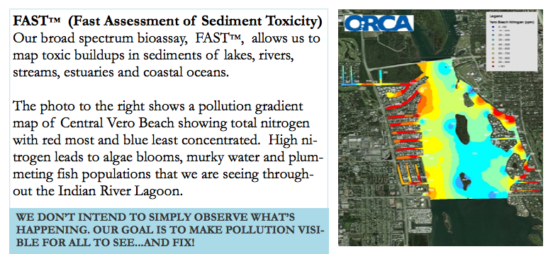Screen Shot 2013-06-26 at 11.18.38 AMWhen Dr. Widder reviewed the pollution gradient map from the Indian River Lagoon, she was floored…the area was almost entirely red. Sadly, much of the analysis work is now a post mortem. Had realtime monitoring been going on, we may have been able to step in sooner to slow this decline. The public is unaware that no one is protecting their life support system. To support ORCA in their efforts to empower community’s to monitor their own waters, click here.