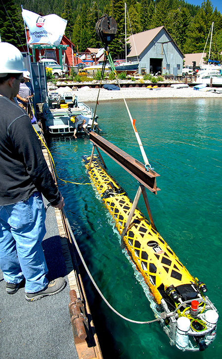 It almost feels like science fiction: a 28-foot long, 2,200-pound robotic submarine that can fit through a 30-inch ice borehole. But observers in Tahoe this past week can attest to the realness — and world-class engineering — of the Sub-Ice Rover (SIR) created by DOER Marine of Alameda for North Illinois University. The craft is designed to explore the ocean underneath the half mile of frozen water known as the Ross Ice Shelf in Antarctica. To clear the borehole, SIR is designed to collapse to a diameter less than 30 inches.