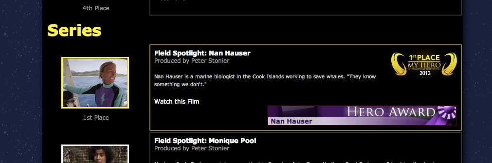 Nan Hauser, the intrepid whale tagger who works in the Cook Islands, recently had her work documented by Peter Stonier the Conservation International filmmaker for the My Hero International Film Festival. The video — available for viewing here — was selected as for first place in the “Series” category, underscoring public interest and support of whale protection efforts.
