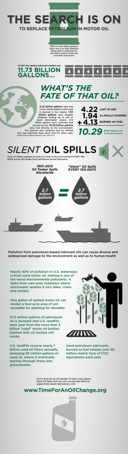 Made from the same toxic substance as gasoline, 2.5 billion gallons of petroleum-based lubricants and motor oils are sold in the United States each year. Of that, 385 million gallons are disposed of every year – 35 times more oil than was spilled in the Exxon Valdez spill!