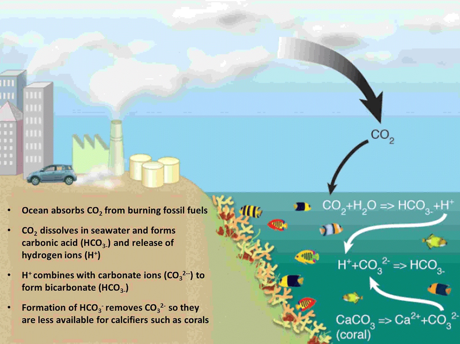 The ocean is absorbing increasing amounts of atmospheric CO2, causing carbonate ion concentration to drop and limiting their availability to corals and other calcifying organisms. © Hoegh-Guldberg et al. 2007.