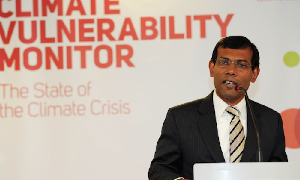 Mohamed Nasheed, the first democratically elected president of the Maldives, is an international champion of climate change action. Unfortunately, he is also a political prisoner, having been found guilty in a sham terrorism trial, and is set to serve a 13 year prison sentence. He is 47 right now and will be 60 when he gets out. Not only were the charges bogus, but the trial was essentially stillborn: the court scheduled a hearing within two hours of his arrest and prevented the defense team from appearing in court because they were required to register two days in advance… a classic catch-22.