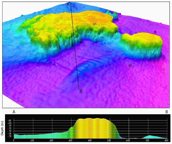 Map profile of Roughtongue Reef, one of three mesophotic reefs directly affected by the Deepwater Horizon disaster. Image courtesy USGS.