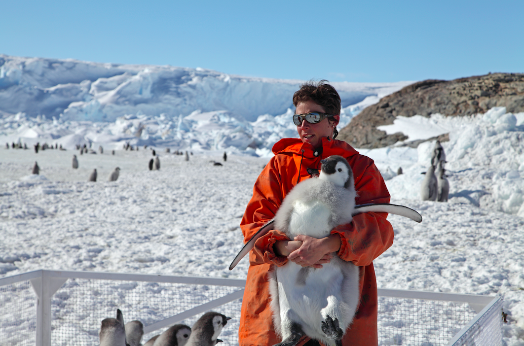 WHOI biologist Stephanie Jenouvrier, seen here holding a young Emperor penguin, says the study’s findings conclude that the Emperor penguin is deserving of protection under the Endangered Species Act. Image: Jenouvrier @WHOI / IPEV