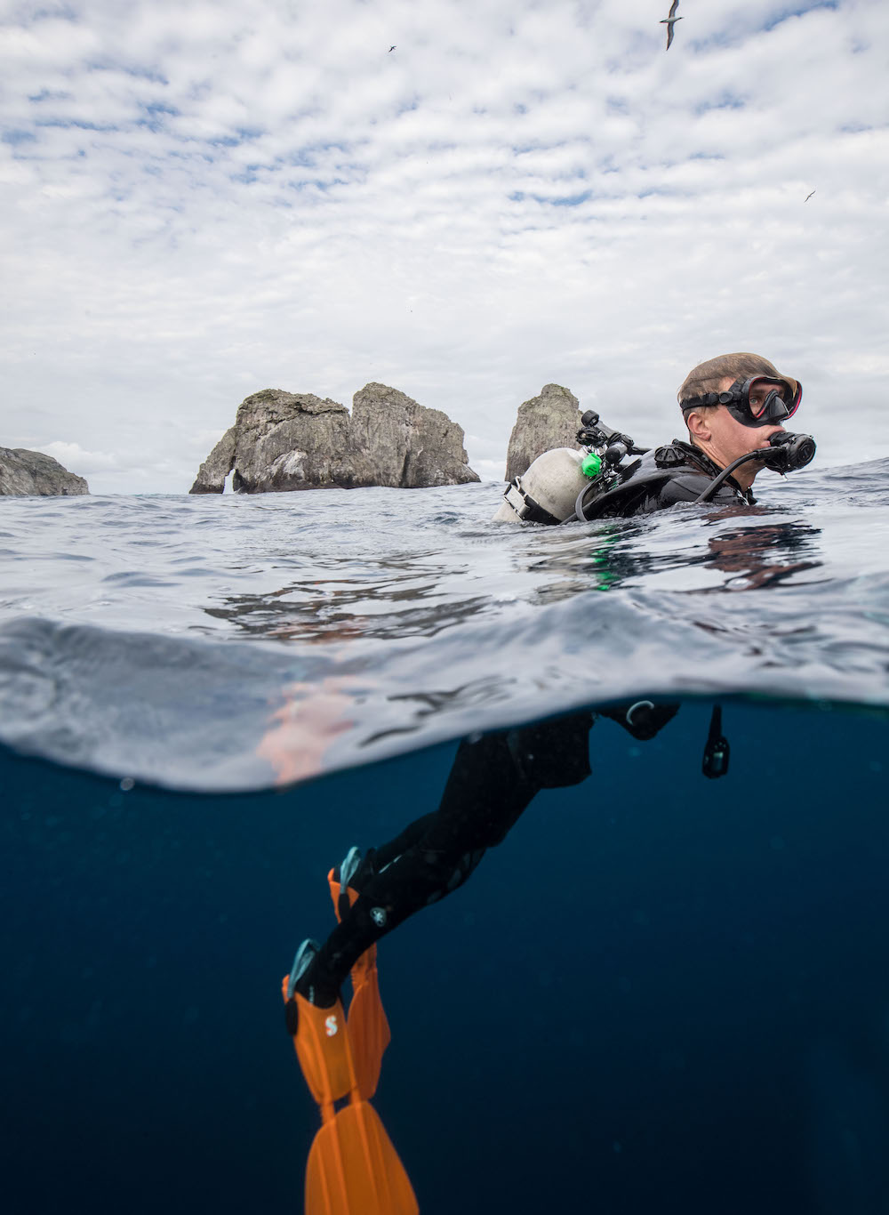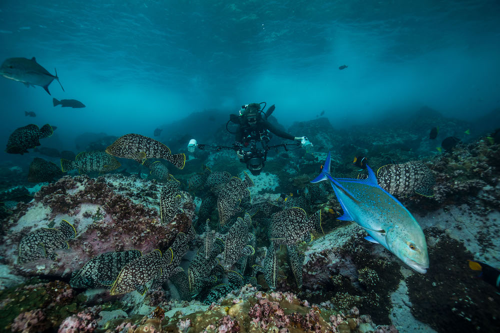 Cuando nos adentramos en sus aguas por primera vez, buceando en un sitio llamado El Arrecife, podemos ver los resultados del trabajo de conservación realizado a través de los años gracias a la alianza de la Fundación Malpelo , junto con la unidad de Parques Nacionales Naturales de Colombia (PNN), el Fondo Acción Malpelo y la Armada Nacional de Colombia. Mientras derribamos con la corriente en cima del arrecife empieza de repente mucha actividad. Escuelas de mero cuero patrullan los espacios entre rocas para encontrar su desayuno. Las morenas los siguen para recoger sobras. Alertos por la actividad entran carangidos al arrecife a buscar un mordisco. Bajo el agua, Malpelo es una explosión de vida.