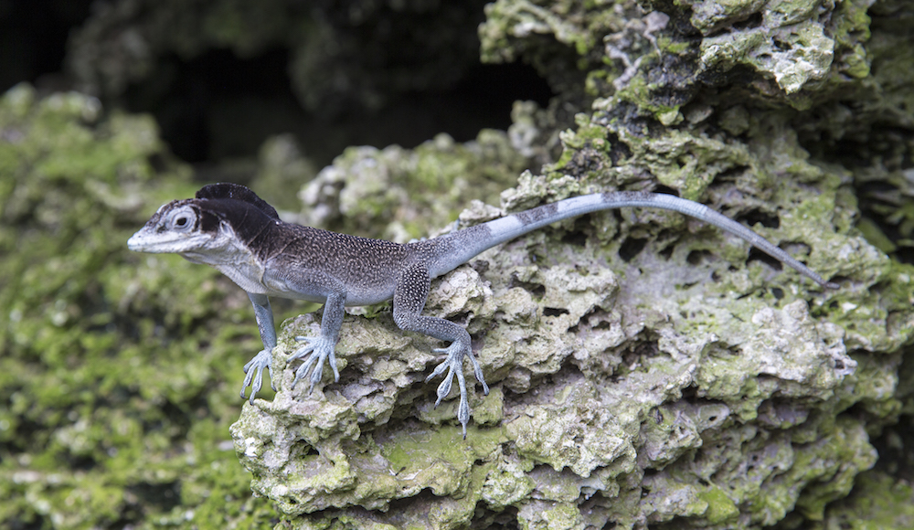 The malpelo lizard boasts a blue speckled skin. Check out the stripes on its tail! (c) Kip Evans