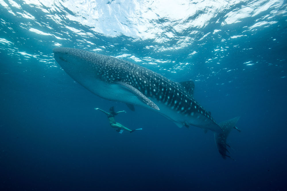 Natalia Vélez Jiménez swimming with a whale shark in the waters surrounding Malpelo Island