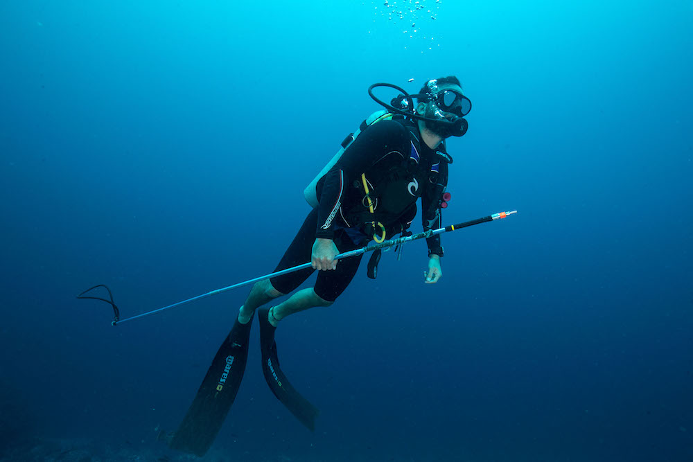 Cesar with a shark tagging pole spear (c) Kip Evans