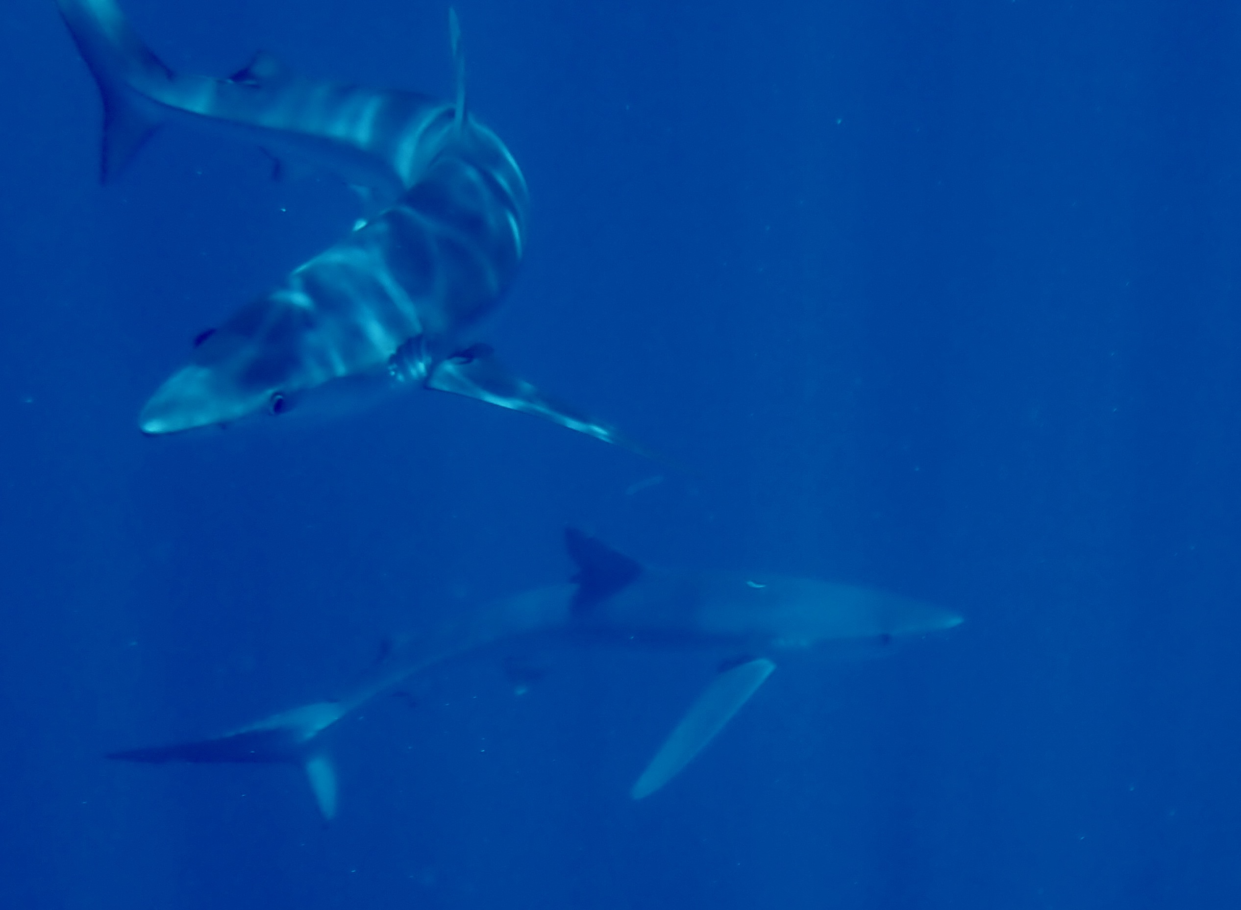 After a while, we said goodbye to the sperm whales and headed towards Pico to try and find blue sharks. Recent research has shown that the Azores serve as an important breeding ground and nursery for blue sharks. Blue sharks are listed as near threatened by the IUCN. Blue sharks are between 6-10 feet in length and weigh between 200-400 pounds. They have slender bodies which allow them to swim at speeds of up to fifty miles per hour. Blue sharks are only protected by fixed quotas, which is unfortunate, as they only offer limited protection. Many still suffer from bycatch, beyond the fixed quota. Dr. Pham says, “Scientists don’t fully understand the extent of mortality and what it represents at the population level.” The shark fin trade is also a great threat. There is a current conservation campaign attempting to convince the seven Portuguese airlines to stop transporting shark fins, reducing the hunting of blue sharks. In addition, there is a threat to the blue sharks from the international fishing fleet. As part of the European Union agreement, European fishing fleets are authorized to operate within an exclusive economic zone, outside a buffer zone, one hundred nautical miles from the coast.