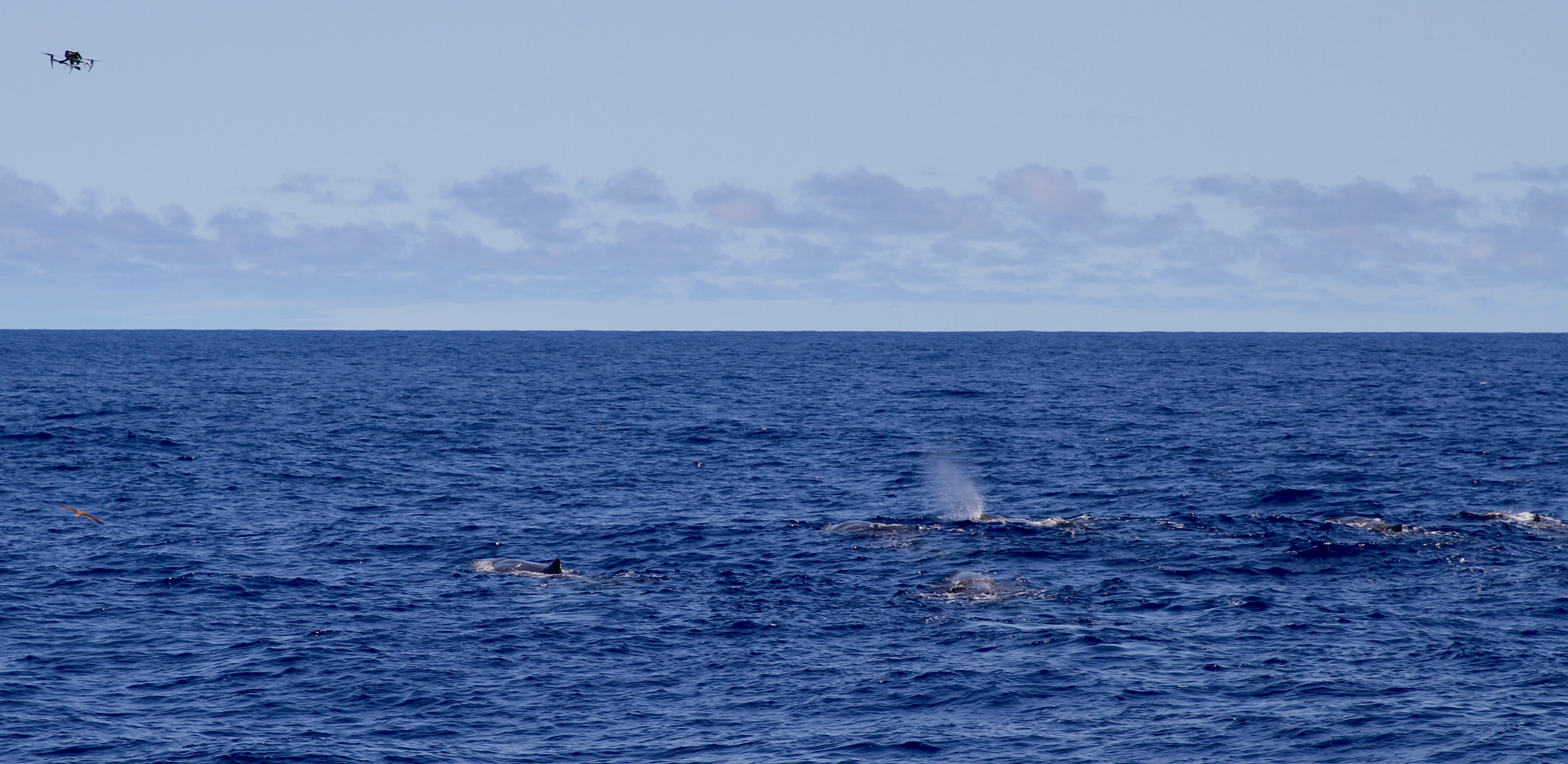 While on the open ocean, we took in the gorgeous views of Faial on one side and Pico on the other. After about an hour, we spotted whales. The Azores are one of the world’s largest whale sanctuaries, boasting more than twenty different types of cetaceans. It wasn’t long ago that the Azores were a whaling capital, but thankfully whaling was officially prohibited in 1982, while the ban was fully implemented in 1986. Now, eco-tourism has become one of the main sectors of their economy. As we approached the whales from a distance, the captain asked me, “what do you want to see today?” I really hoped to see sperm whales, as I’ve never seen them in person before. Sure enough, just ahead of us, a pod of four sperm whales swam about, and then another three together about fifty yards away. We were all excited, impatiently waiting for a view of a fluke, some spi hopping or a breach, but they were in relaxation mode. The whales were swimming at the surface, followed by some short dives spanning five or ten minutes. We did, however, have the chance to see something rather unique. The previous night, we met Dr. Ian Kerr, who oversees a project that samples whale blows using a drone called the Snotbot. We were able to see the Snotbot in action, as it sampled the blows of the sperm whales we were watching. They would fly the drone and have it hover above the whales, attempting to collect their samples when the whales exhale. They then share the samples with universities and institutions all working on various types of whale research.