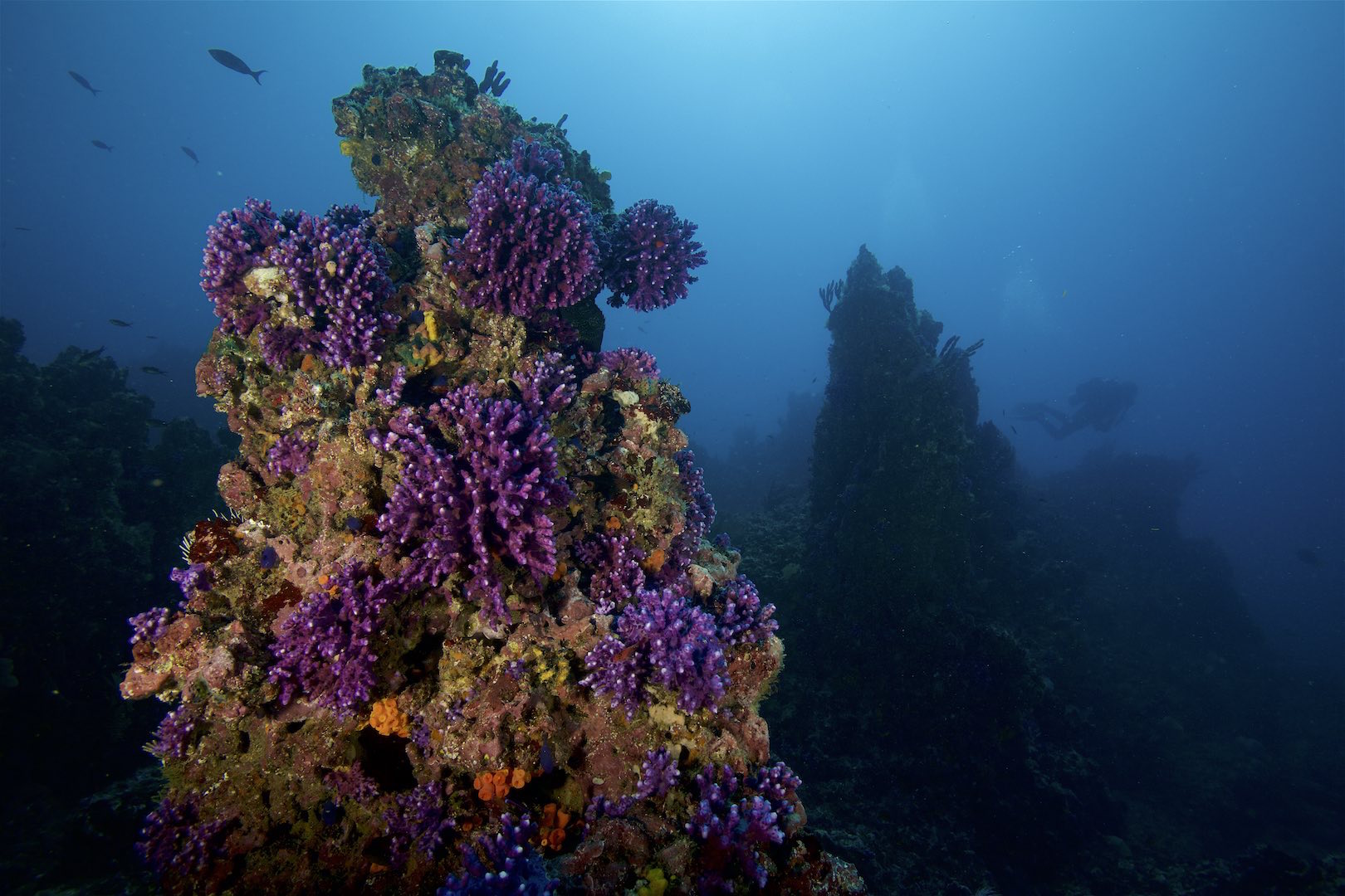Blue Coral (Distichopora robusta) growing on submarine rock outcrops at approx 15-20 M depth off the SW corner of Jicarita Island. This unique coral species was first discovered here at this location, and is only known from small areas of Coiba National Park and some nearby sites in the Gulf of Chiriqui. (c) Tim Laman