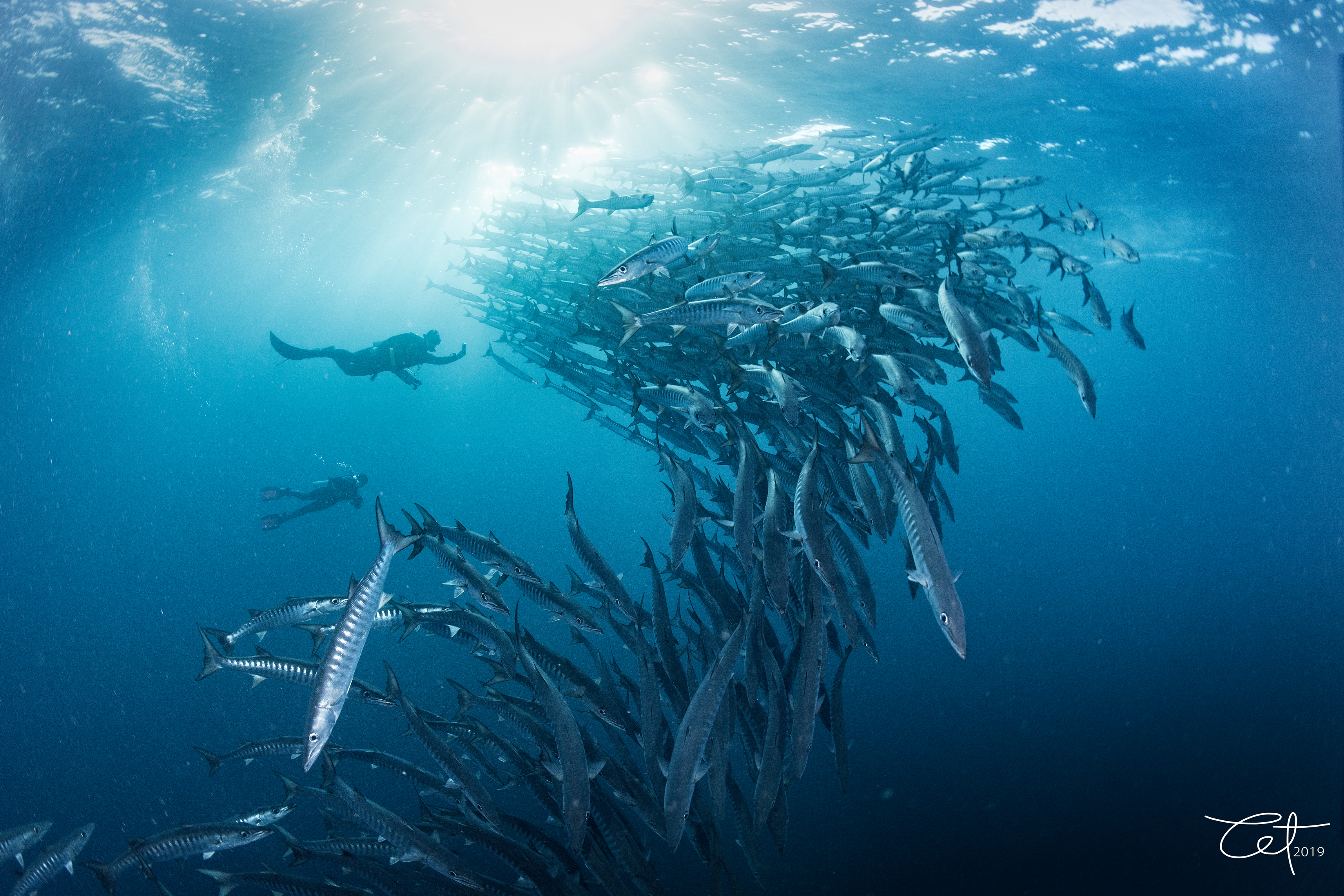 Divers with a school of blackfin barracuda (c) Tet Lara