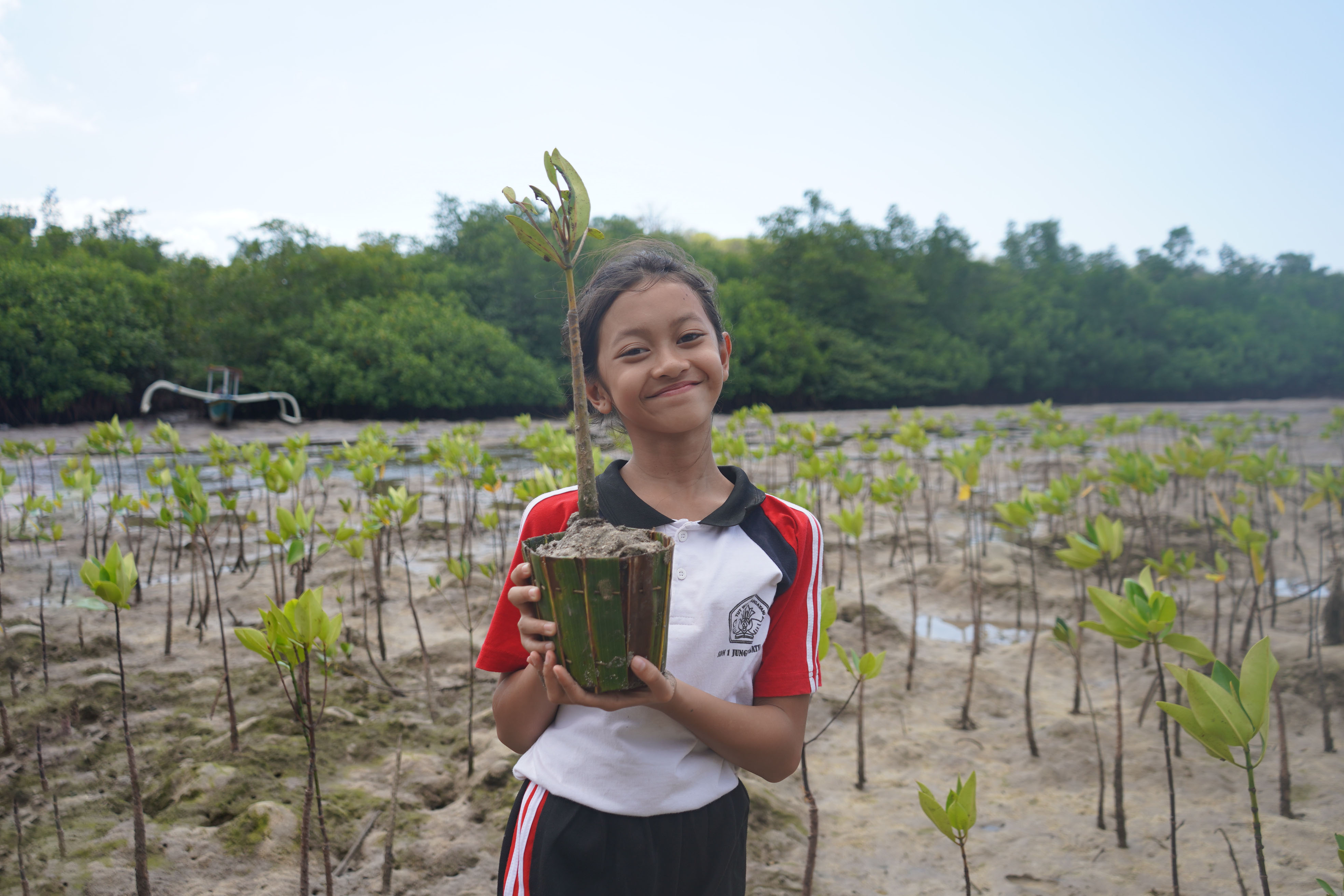 A student from Nusa Penida MPA with a young mangrove seedling before planting