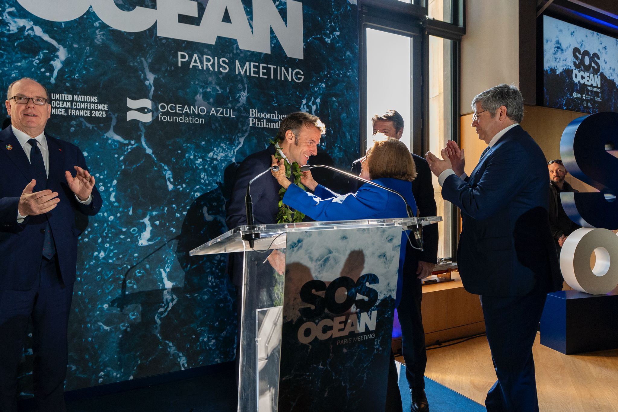 As the Eiffel Tower is symbolically illuminated in blue, ocean advocates Dr. Sylvia Earle and Nainoa Thompson present French President Macron with the SOS Ocean Manifesto at the lead-up event to UNOC-3. Image courtesy of Presidence de la Republique France.