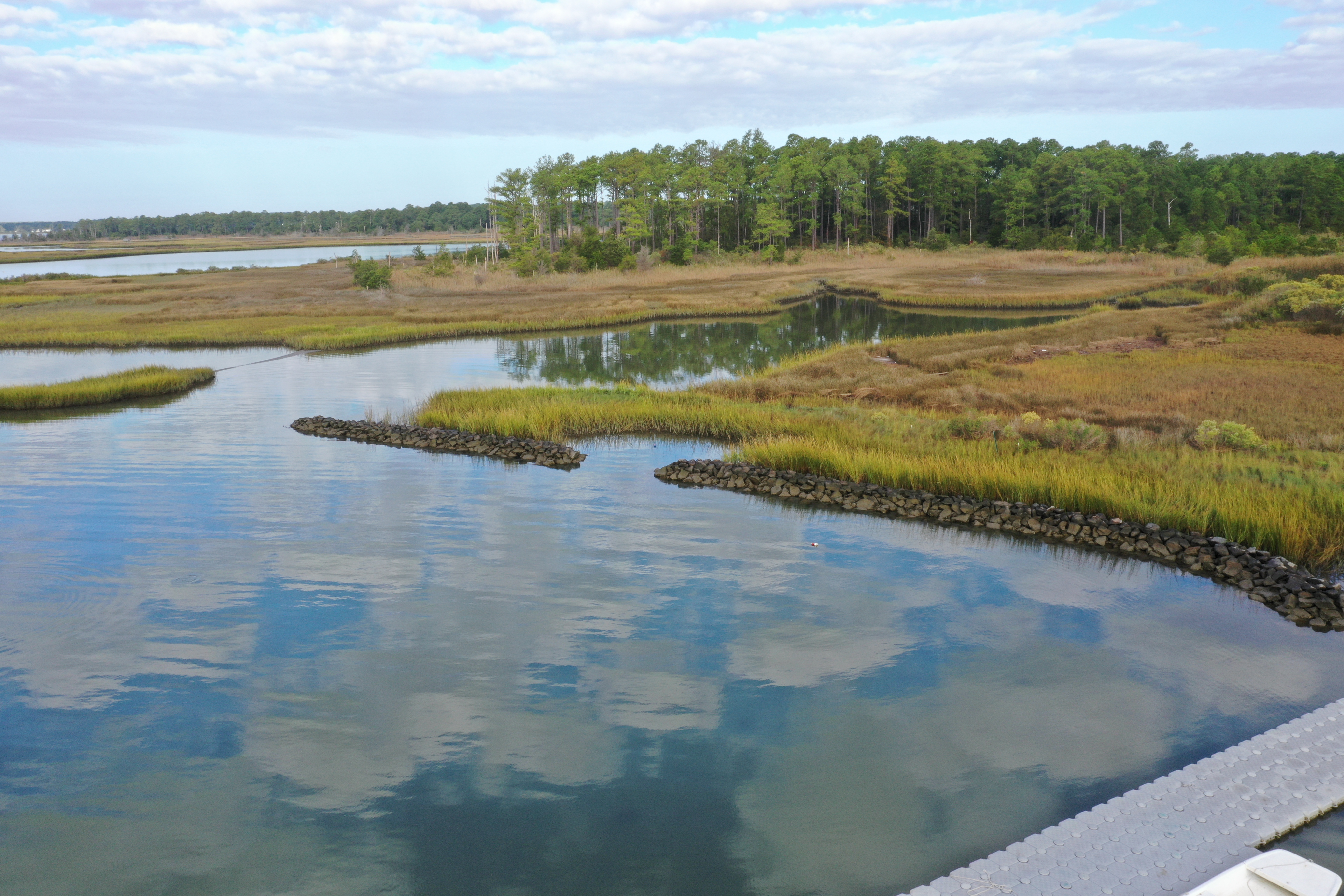 Captain Sinclair Living Shoreline, Eight Years After Installation. Drone Image: ASBPA Best Restored Shore, 2023. Shoreline Studies Program, VIMs