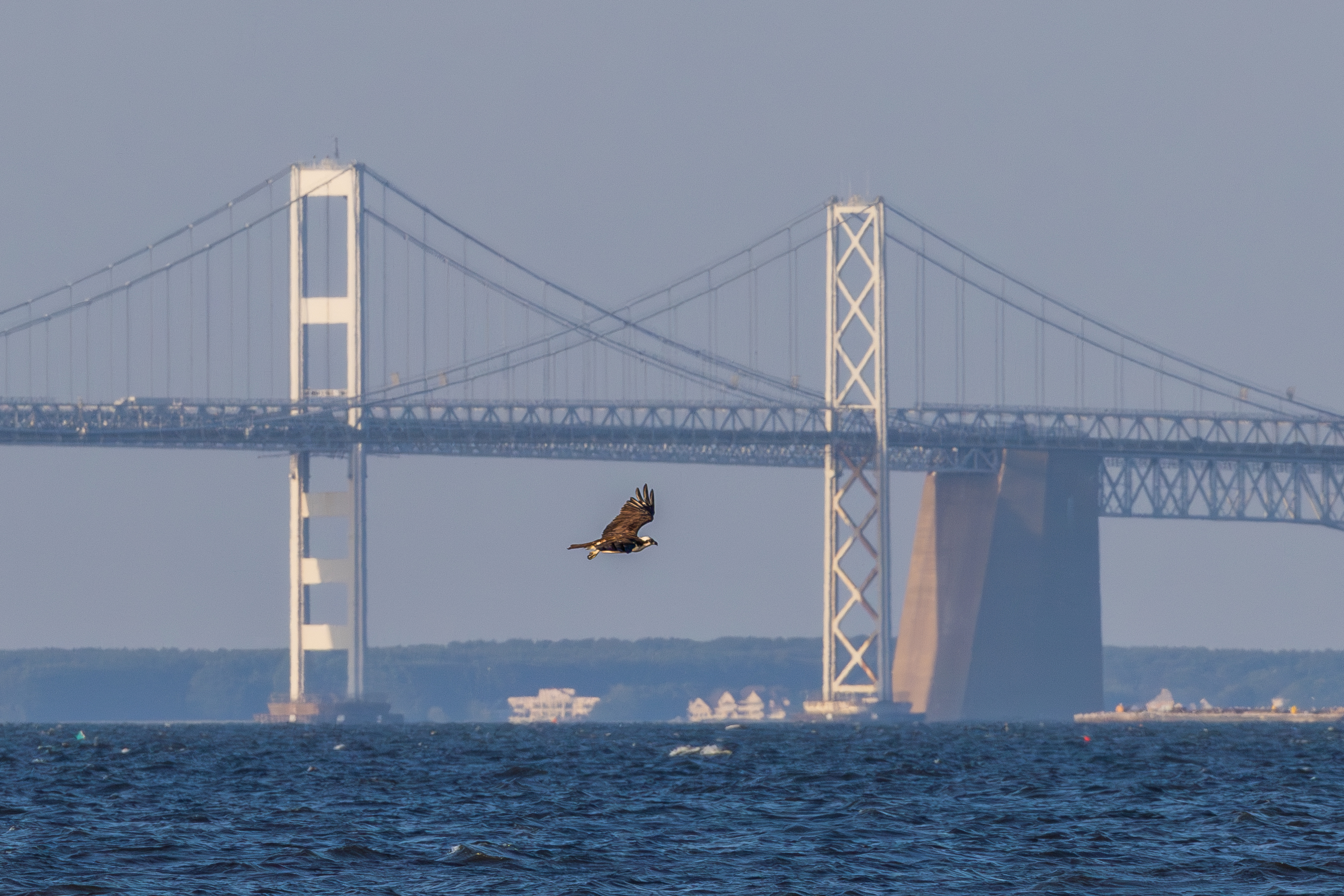 An osprey flies over the Chesapeake Bay in front of the Bay Bridge, seen from Elktonia-Carr’s Beach Heritage Park in Annapolis, Md., on June 21, 2024. Photo courtesy of Rhiannon Johnston/Chesapeake Bay Program.