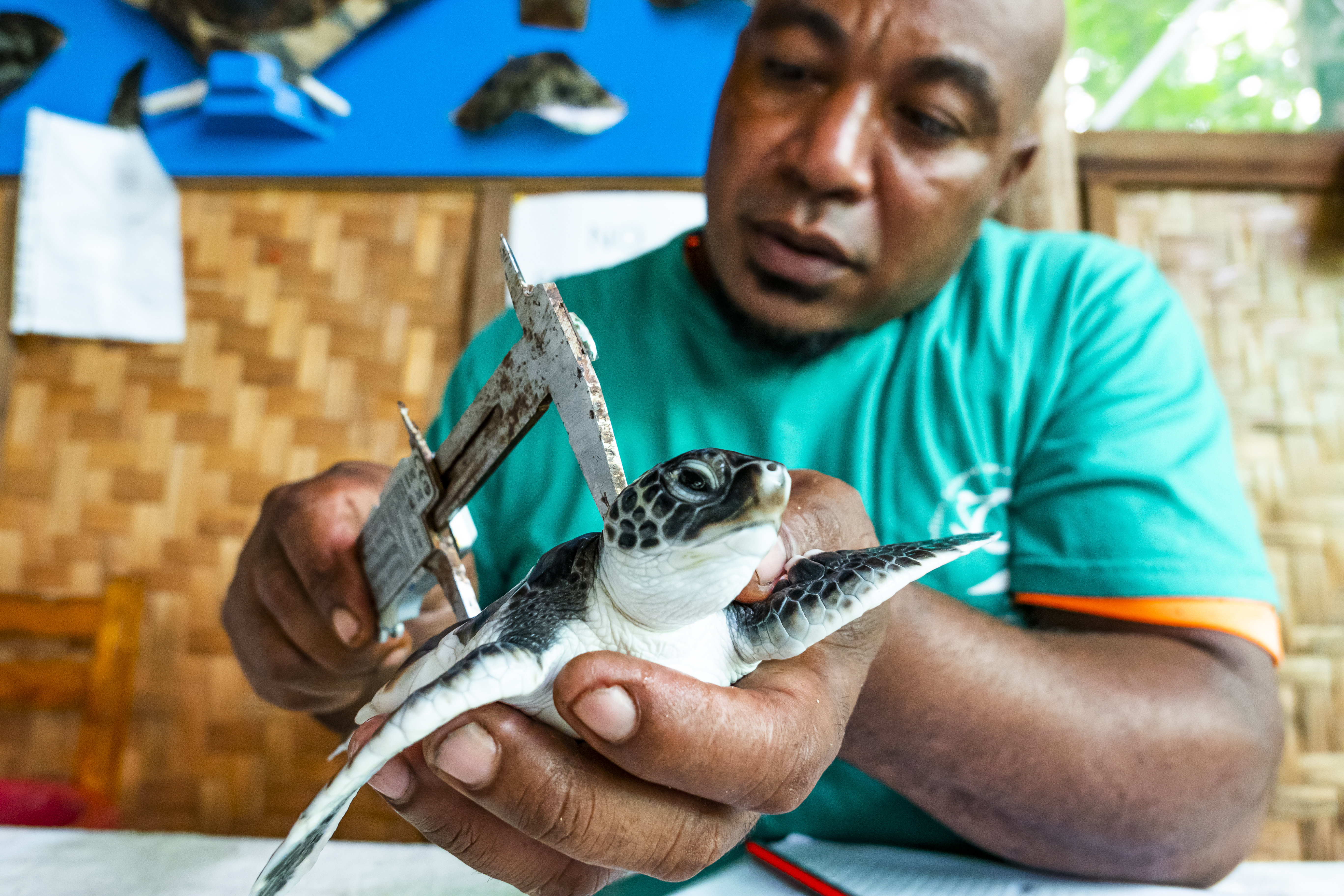 Ranger conducting sea turtle research. Credit – Migration Media.