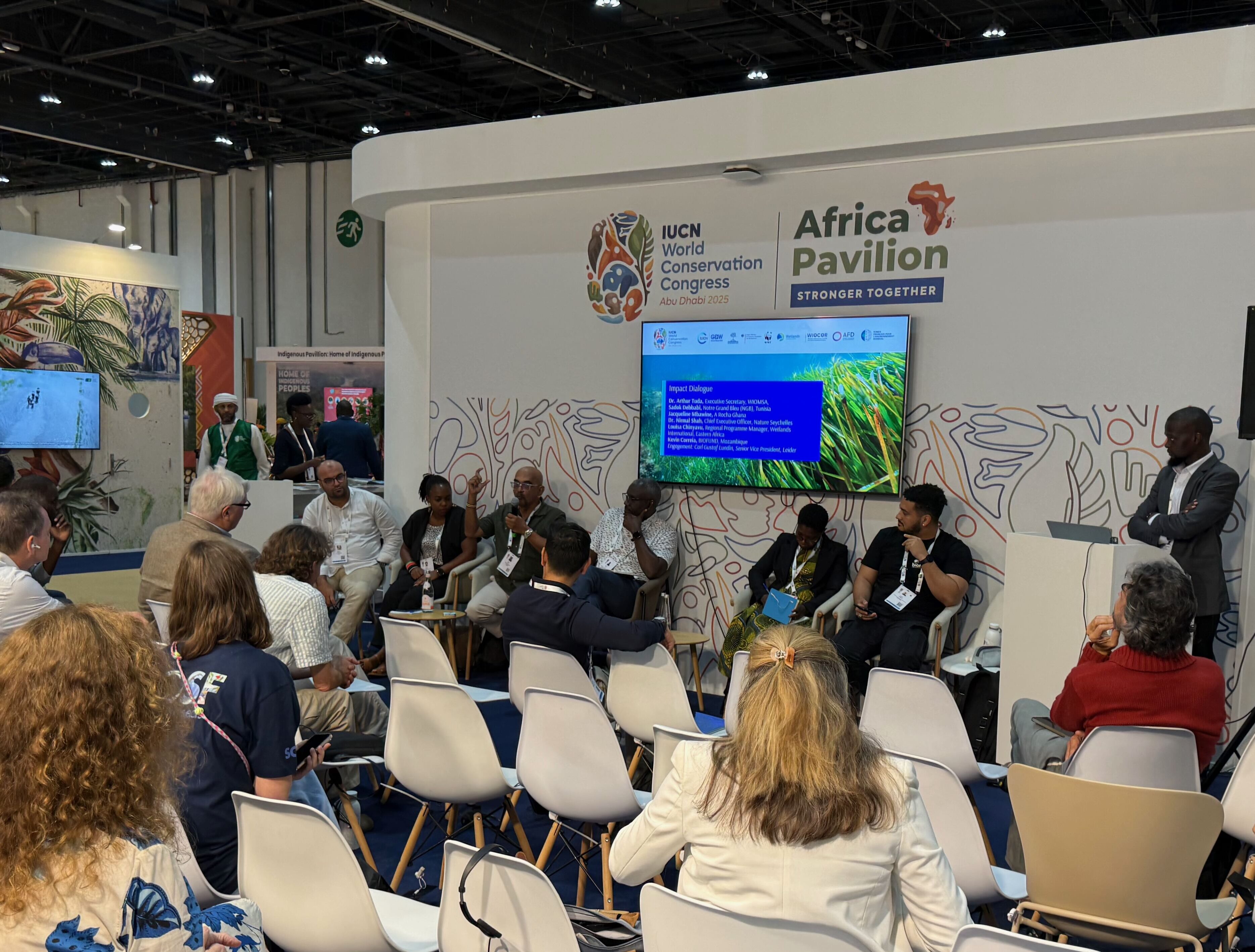 Panelists discuss “Blue Nature – From conservation to sustainable financing for improved livelihoods” during Ocean Day at the Africa Pavillion. © Tessa Hempson